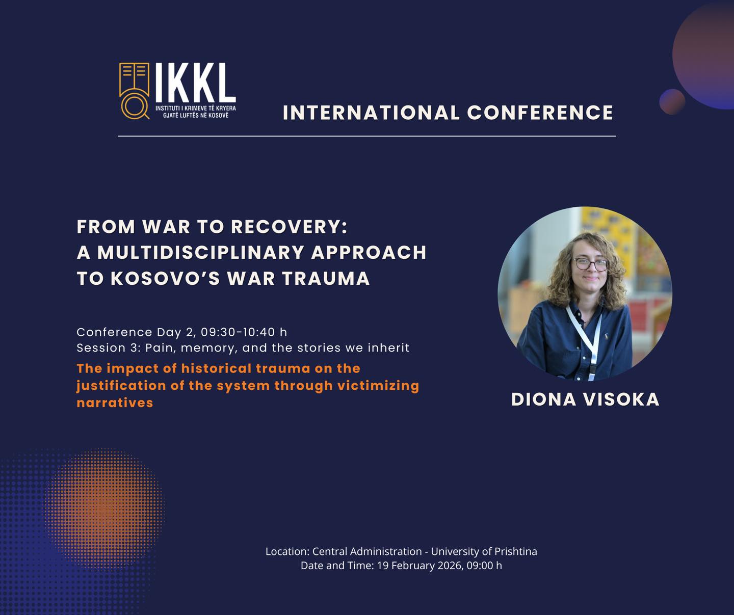 Merr pjesë në konferencës e IKKL-së si bashkautore me punimin shkencor: “The impact of historical trauma on the justification of the system through victimizing narratives”.