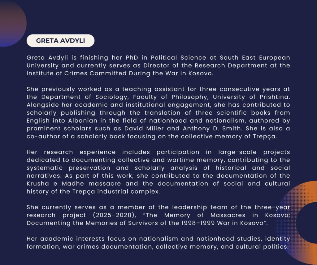 – Aktualisht është pjesë e ekipit udhëheqës të projektit trevjeçar (2025–2028) “Kujtesa e masakrave në Kosovë: dokumentimi i kujtesës së të mbijetuarve në Kosovë gjatë luftës së viteve 1998–1999”.