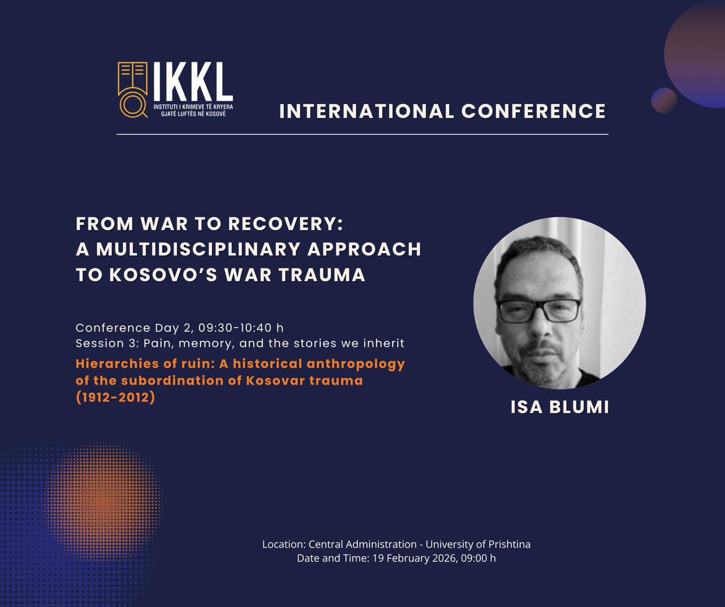 Merr pjesë në konferencës e IKKL-së me punimin shkencor: “Hierarchies of ruin: A historical anthropology of the subordination of Kosovar trauma (1912-2012)”.