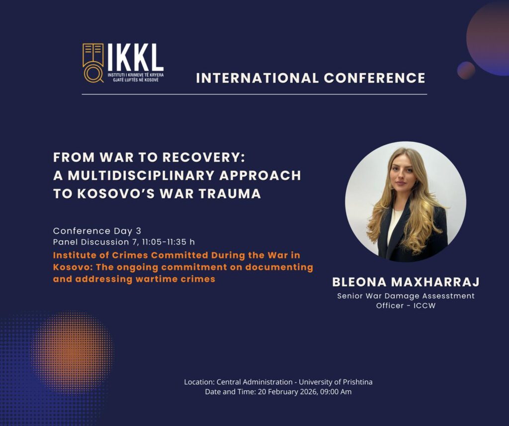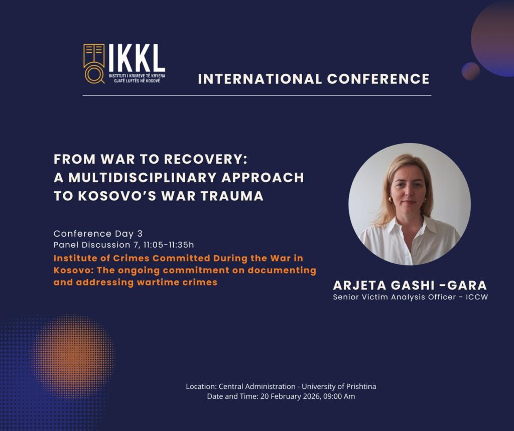 Ky panel do të trajtojë angazhimin e vazhdueshëm të Institutit të Krimeve të Kryera Gjatë Luftës në Kosovë në dokumentimin, analizimin dhe adresimin e krimeve të kryera gjatë luftës në Kosovë, duke theksuar rëndësinë e dokumentimit profesional për drejtësi, ruajtjen e kujtesës institucionale dhe mbështetjen për viktimat.