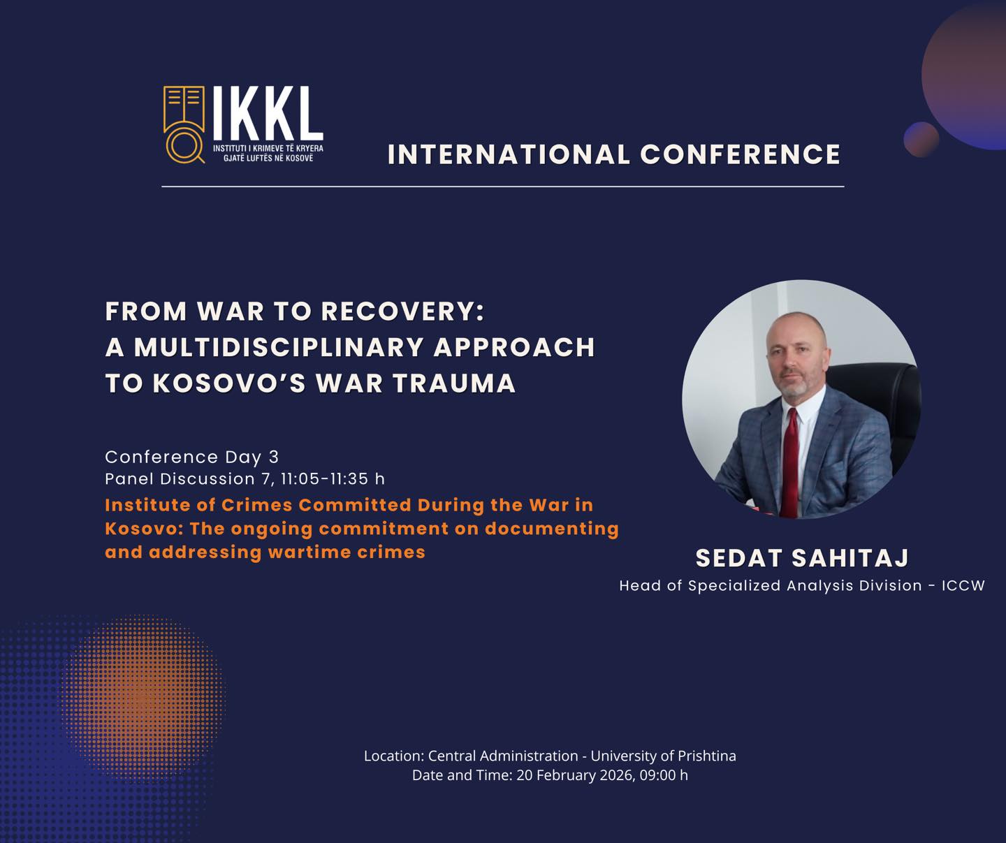 Ky panel do të trajtojë angazhimin e vazhdueshëm të Institutit të Krimeve të Kryera Gjatë Luftës në Kosovë në dokumentimin, analizimin dhe adresimin e krimeve të kryera gjatë luftës në Kosovë, duke theksuar rëndësinë e dokumentimit profesional për drejtësi, ruajtjen e kujtesës institucionale dhe mbështetjen për viktimat.